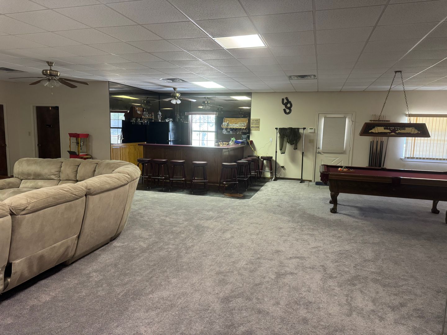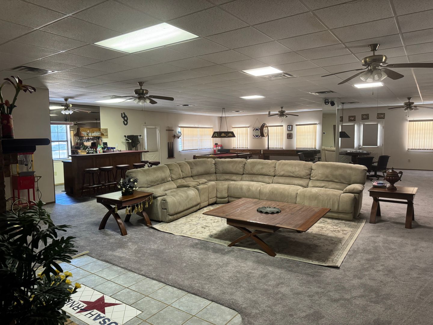This hideaway in the woods in Winnsboro is perfect for gathering and entertaining. It comes fully furnished and is ready for move in. The living area is massive featuring a huge sectional couch, several tables with rolling chairs, a pool table, a shuffleboard table, a fireplace, and a full bar. Outside, the property has covered porches, a detached cabin for additional storage or stay, and a pond perfect for fishing and canoeing. This property also has plenty of storage, featuring a pull through garage with two automatic doors. Call us today to check it out.
